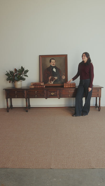 An elegant early 20th-century English oak console table, showcasing classic craftsmanship and timeless restraint. Crafted in solid oak with a warm, medium-to-dark patina, this piece features a long, narrow profile with functional drawers—making it as practical as it is refined. Its versatility allows it to live beautifully in an entryway, hallway, dining room, or behind a sofa.