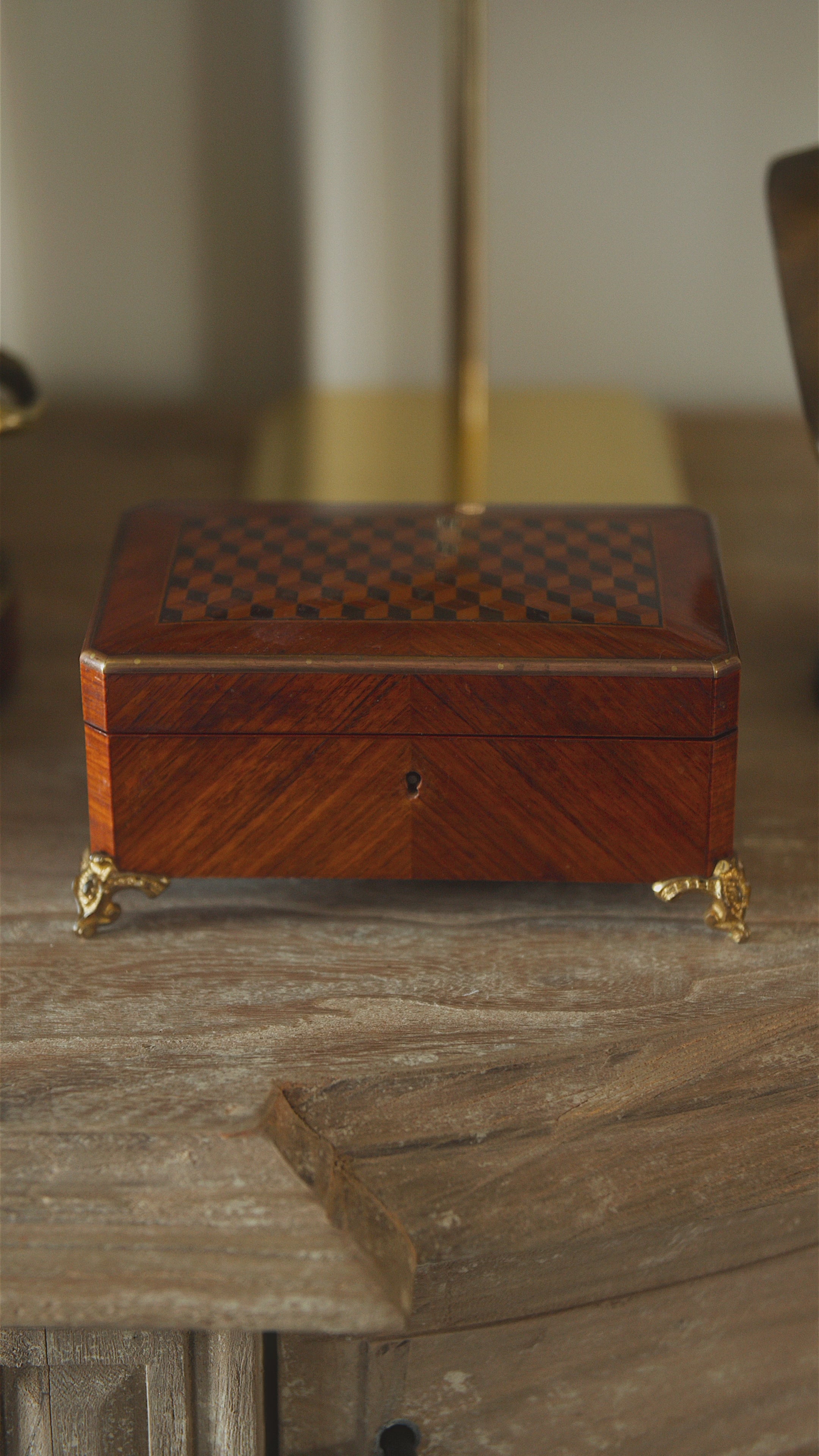 Resting on ornate bronze feet, the box has a balanced, architectural elegance, its proportions and angles softened by the warm patina of time. A brass escutcheon at the front bears the delicate signature of Chevalier et Bénard, a known maker of fine boxes during the Napoleon III period. Though the original key is no longer present, the charm of the box remains undiminished.